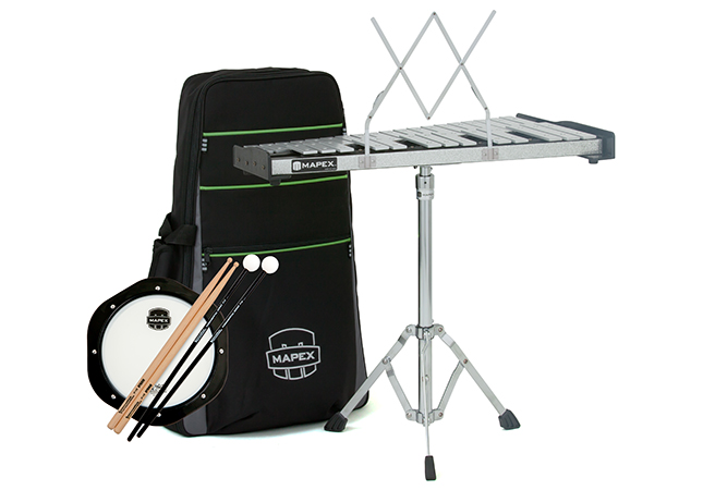 Backpack Percussion Kit, 2.5 octave 32-note keyboard (F5-C8) with Silver Sparkle front rail, 1" wide tone bars, removable music rack, Innovative Percussion F12 IP-HB sticks and mallets, practice pad, adjustable stand