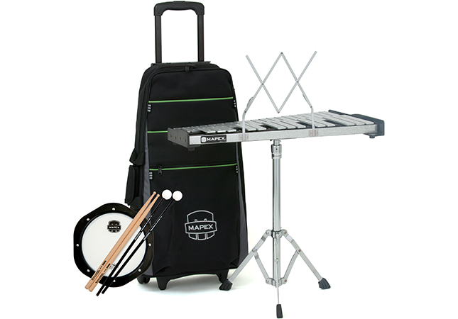 Backpack Percussion Kit, 2.5 octave 32-note keyboard (F5-C8) with Silver Sparkle front rail, 1" wide tone bars, removable music rack, Innovative Percussion F12 IP-HB sticks and mallets, practice pad, adjustable stand, Integrated Roller Bag