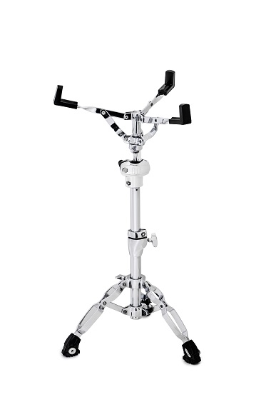 The basket is centered directly over the stand base to improve the balance of heavier drums and to allow unobstructed positioning of the feet between the pedals.