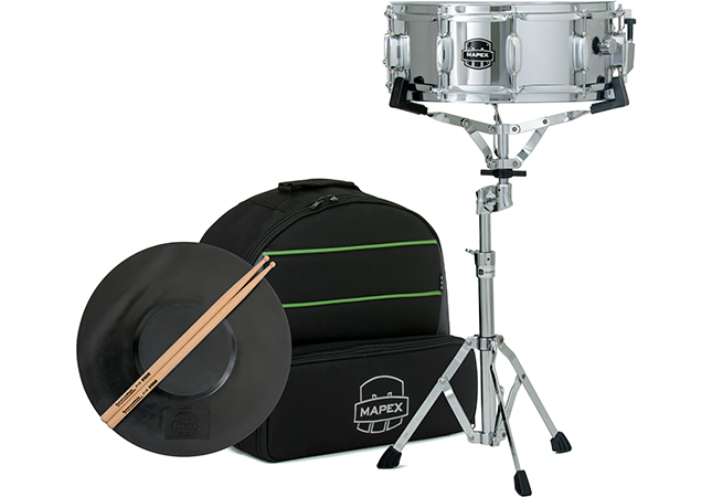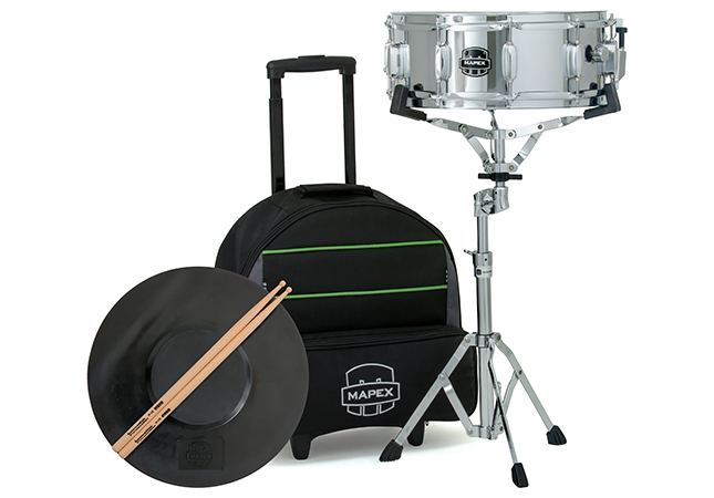 14" x 5.5" ten lug chrome snare, practice pad, adjustable stand, Innovative Percussion IP-HB sticks, Integrated Roller Bag