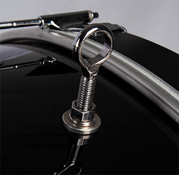 Externally adjustable eyebolt system to easily suit each individual player without removing drumheads.